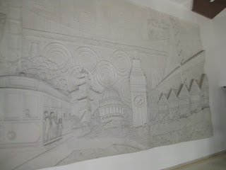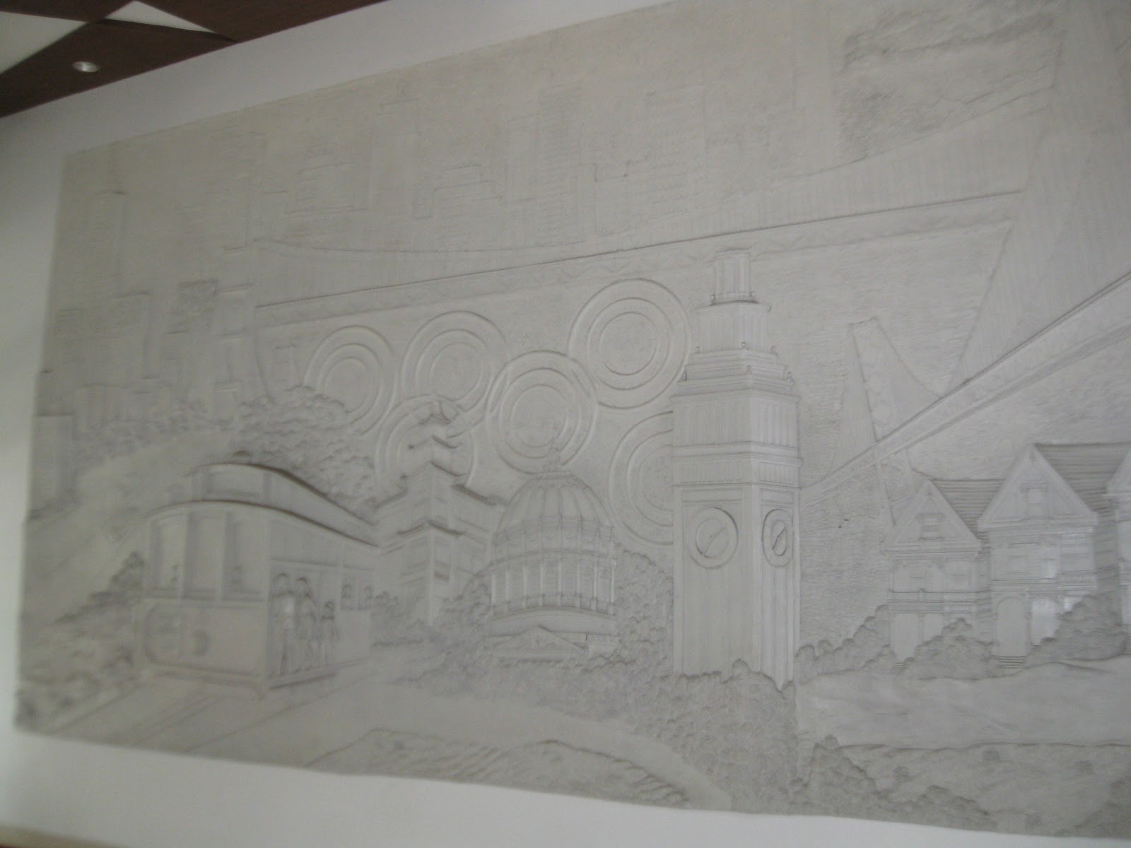 The hotel we are staying in is called “The SFO Hotel”, by someone with an obvious love for San Francisco. Most of the hotel is San Francisco themed. The name reflects the 3 letter airport code for San Francisco International Airport. There’s a huge concrete sculpture-mural-collage on the wall of the lobby. The floors all have photos of San Francisco in the hallways, and each floor is themed after a different area of the city. There are two restaurants.