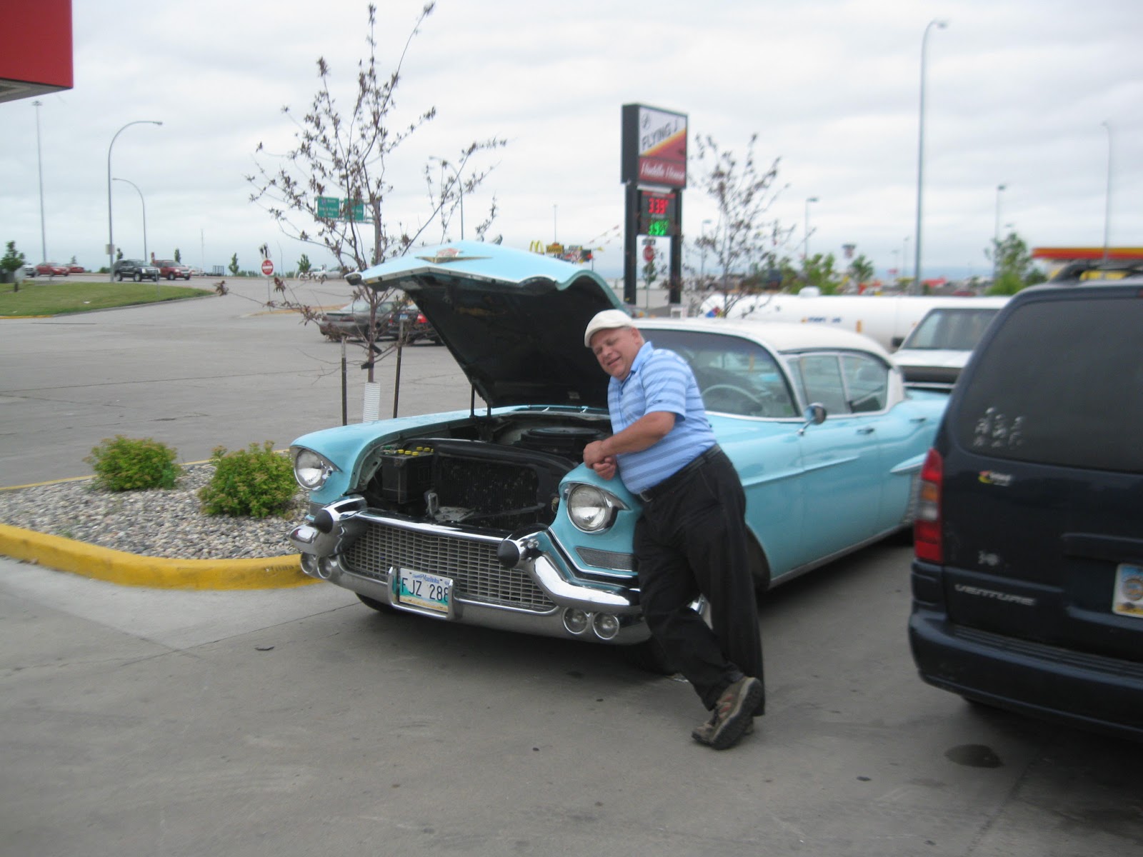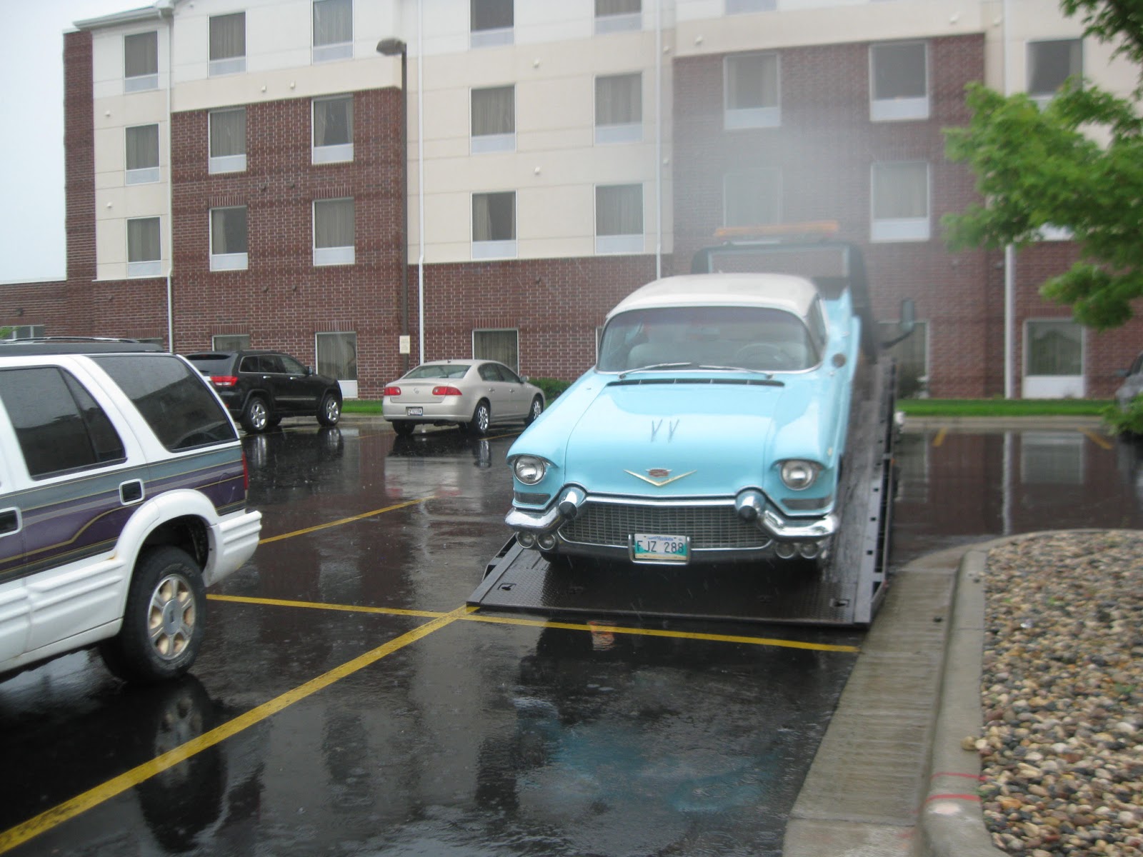 OK, so we have to stay the night in Fargo. Oh well, I booked the hotel that I had stayed in when I was down on my TN visa trip, and we made our way to the hotel. It was only 3 miles or so away, so I drove the ’57 over. Ugh, it sounded horrible! And, to get enough power to go up over the Interstate, it sounded even worse, and had no power! Eric was behind me, and said it blew a nice shade of blue out the tailpipe. Argh. We got to the hotel and parked it.