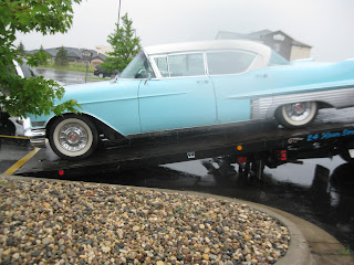 The rain let up just long enough to allow Eric and I to empty the contents of both cars onto the parking lot behind them, then rationalize it all down. Some tote bins were innocuous and could be left in the ’57. Some had liquids in them that really shouldn’t sit too long (could leak and damage upholstery – especially when loading / unloading onto a car carrier). Some stuff was low value and was discarded. In the end, we cut down to the bare minimum in the 2005 de Ville, and all the stuff I don’t need for a while into the ’57.