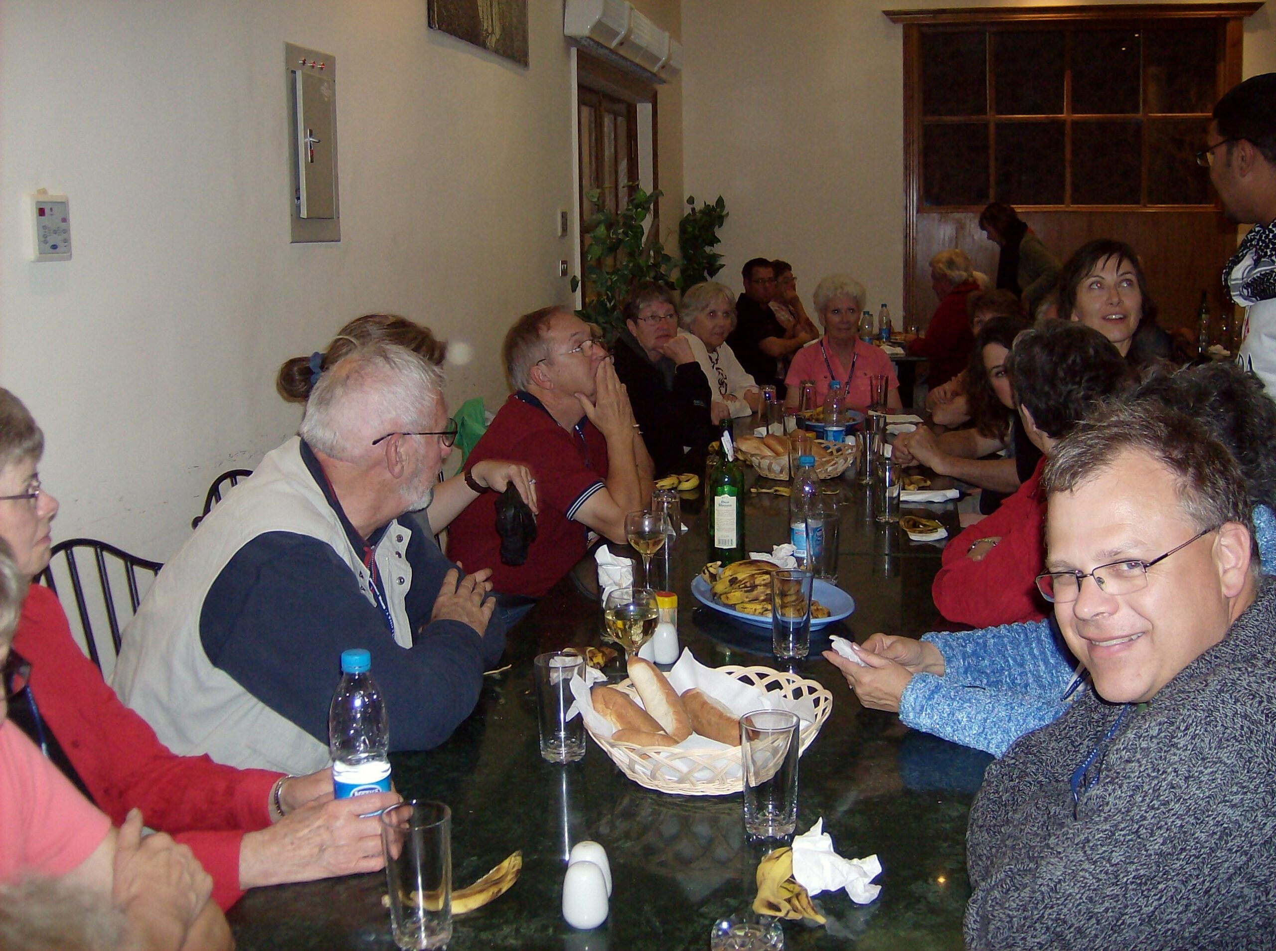It was during one of the serene plains stretches that our bus passed a fuel tanker. The tanker driver honk-honked as we passed, as they seem always to do. However, we immediately pulled off of the road and stopped. One of the staff members (I think he is an alternate driver) jumped out, was gone for several minutes, returned, and we were on our way again. Dayna said that she saw him carrying something blue, like bus body paint colour, into the bus. Yikes!