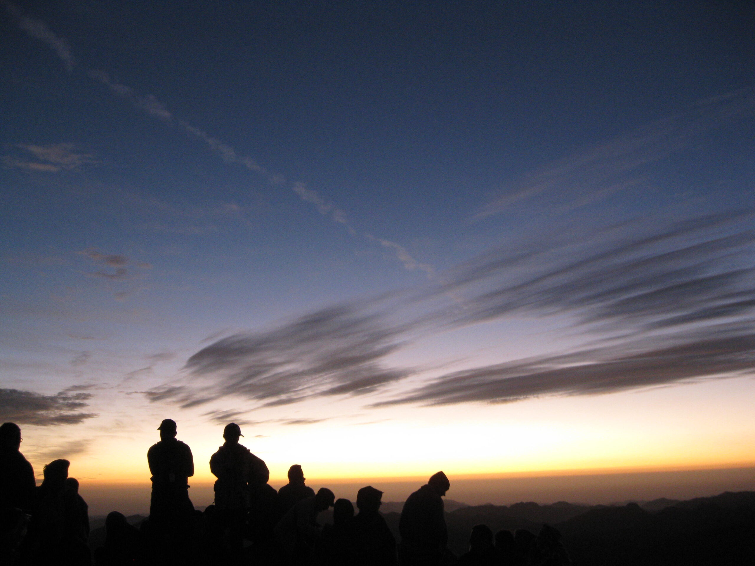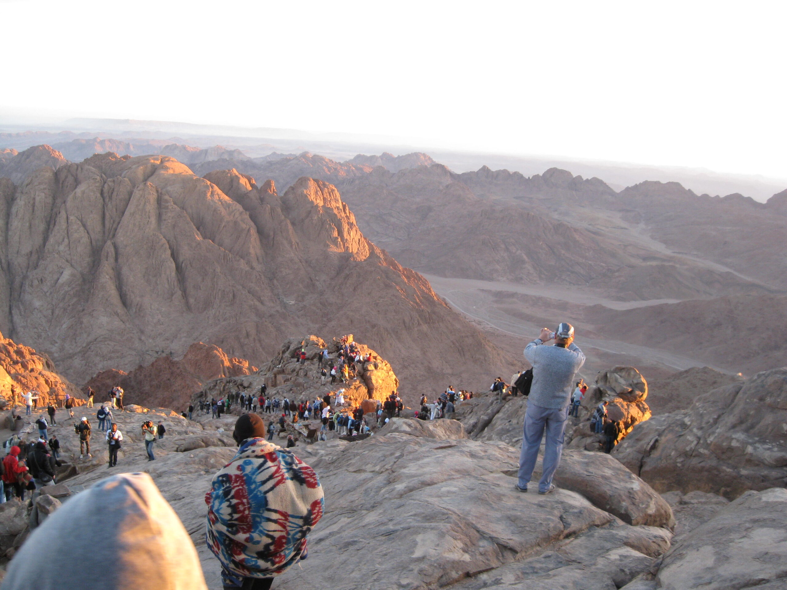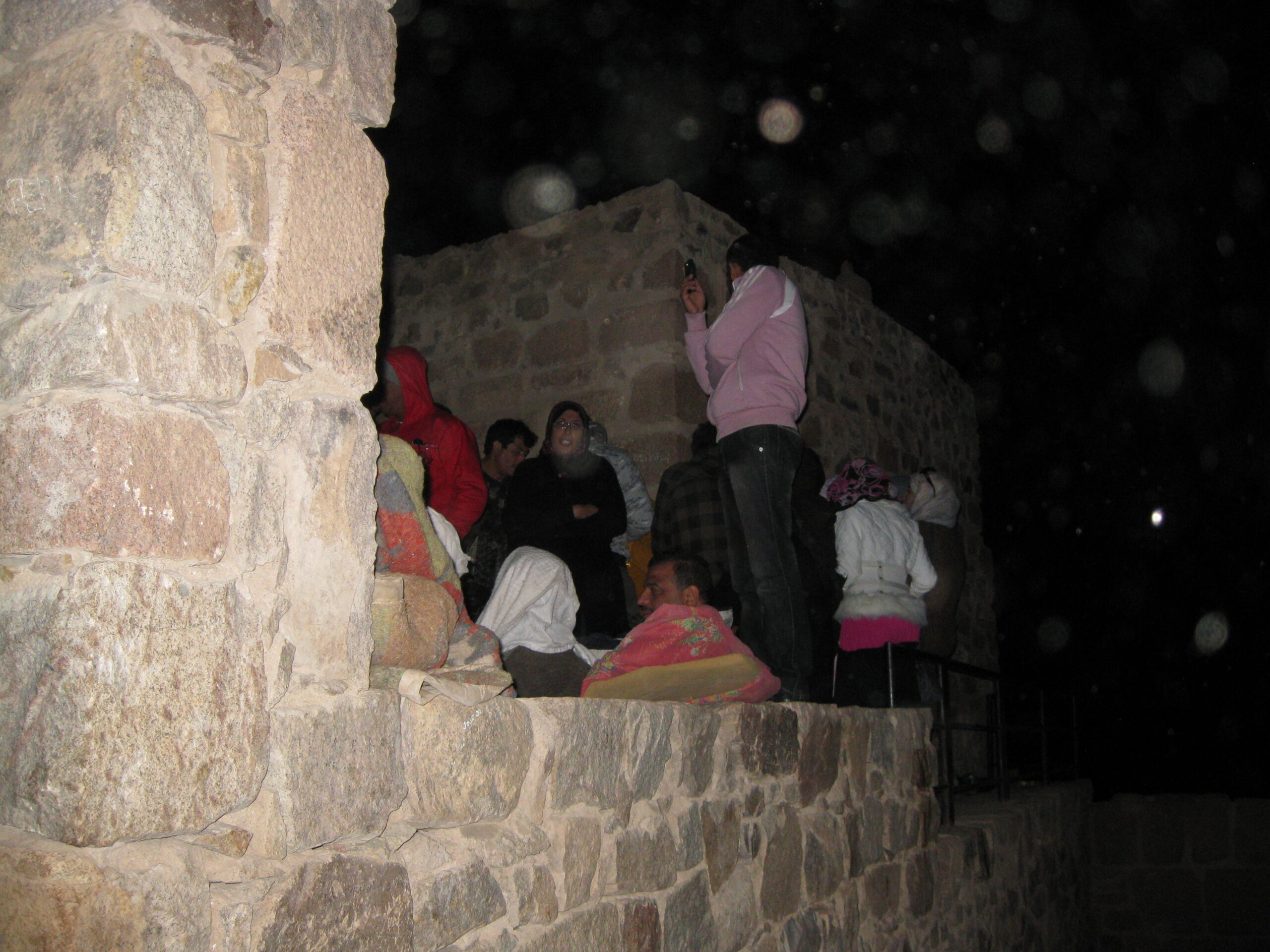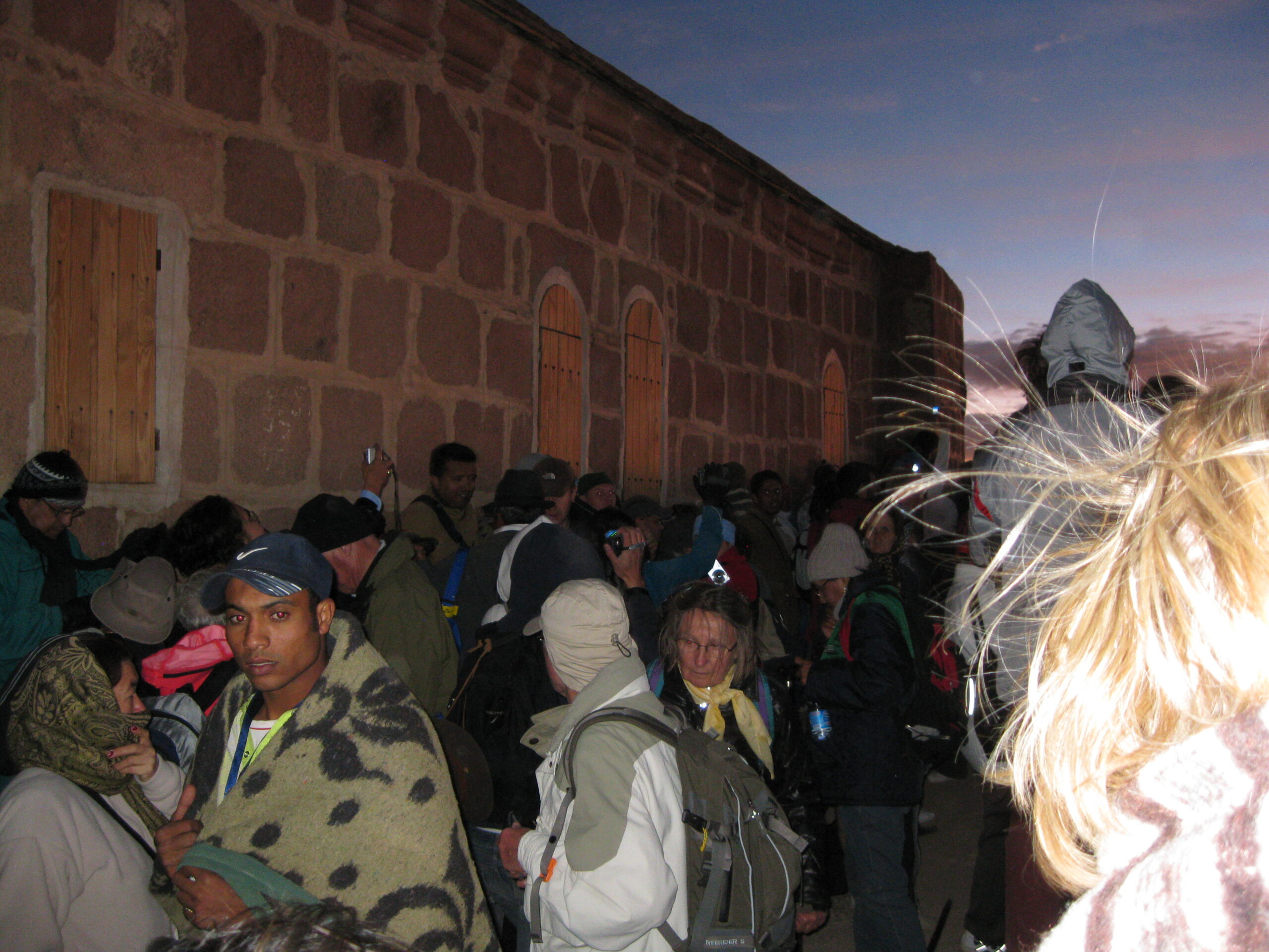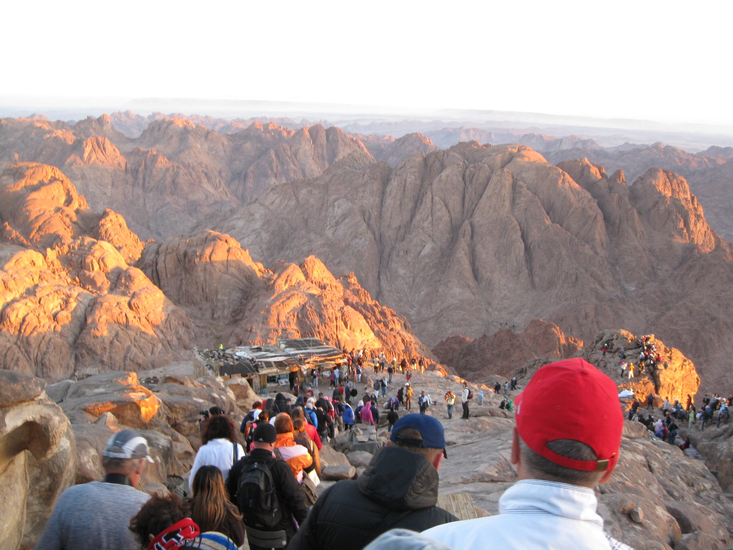 On the summit, there is a small chapel and a small mosque, with stone terraces, stone steps and low stone walls. So, how many people do you think could fit up there? My guess is about five to seven hundred. It was packed! All the good spots for viewing the sunrise were taken, but we managed to squeeze a spot on some stairs and wait.