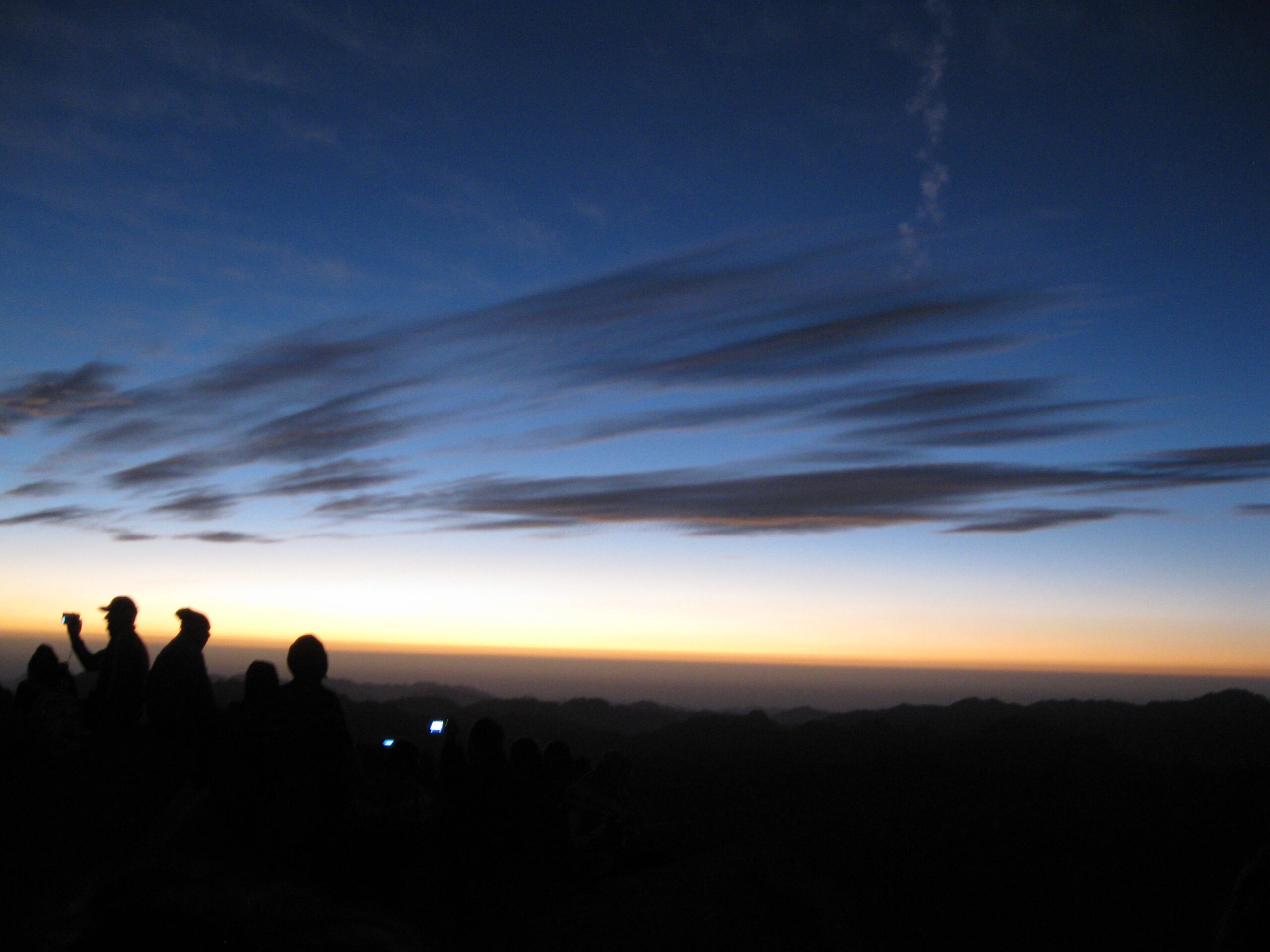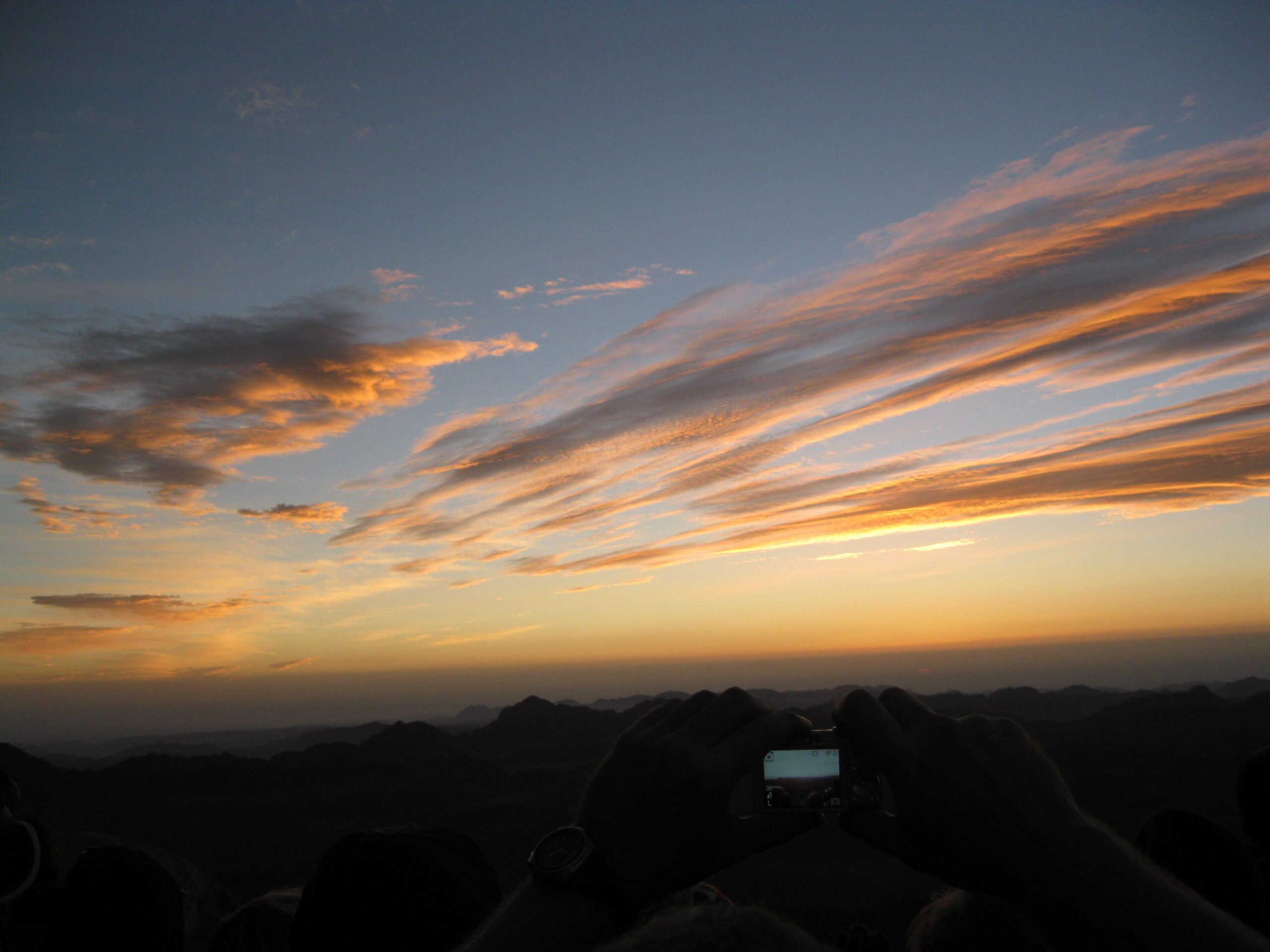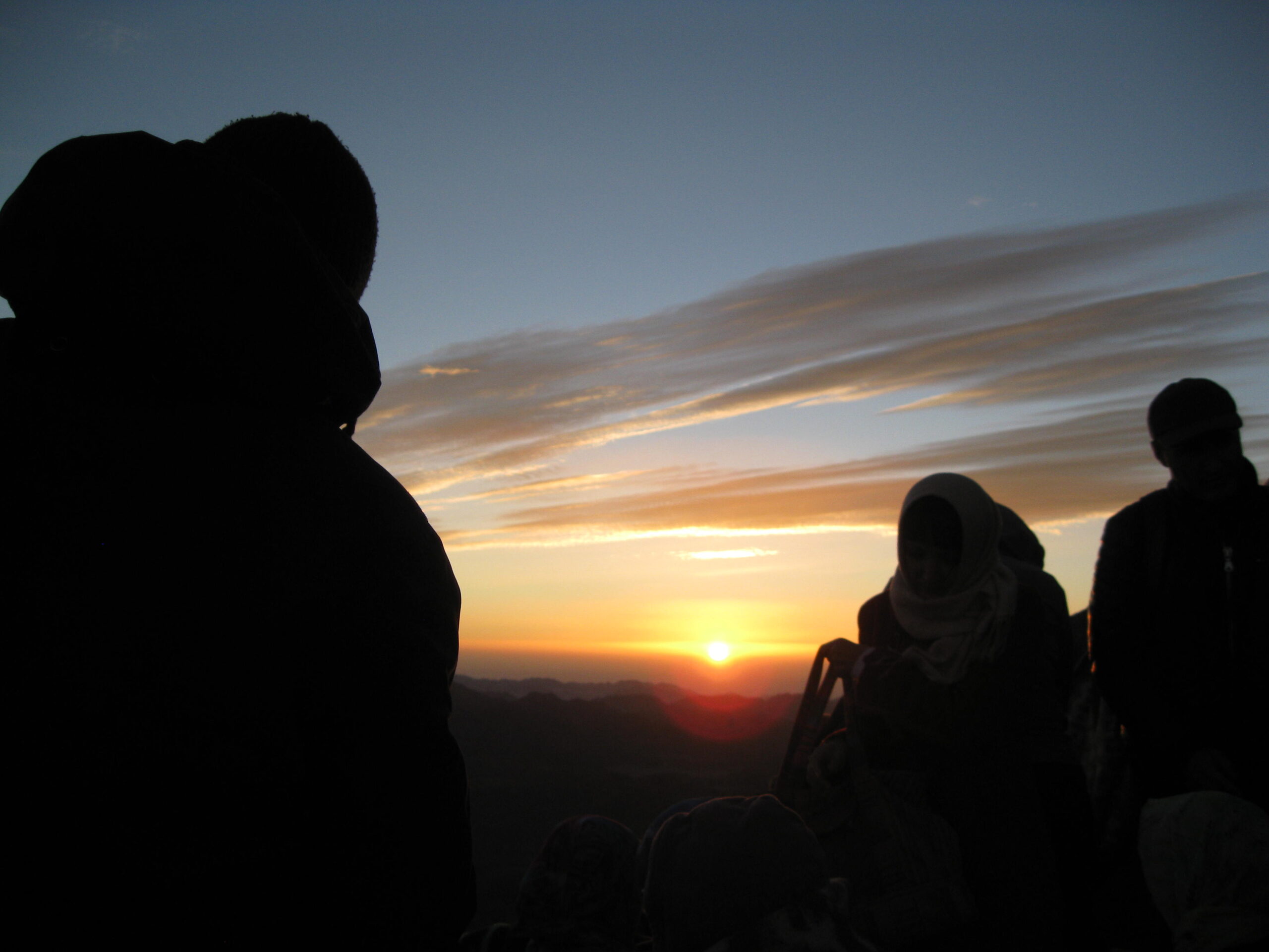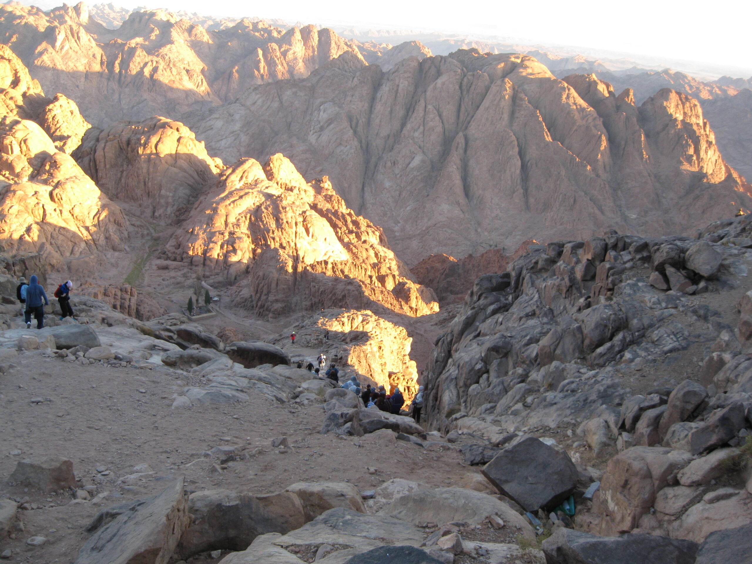 There was a hazy cloud on the horizon to the east, so the sun didn’t rise cleanly above the horizon. I got several photos of the sun “almost” risen, but the crowd, the smoke (yes lots of smoking everywhere in Egypt!) and the cold got to me and I started the way back down. Well the sun broke through as I descended the first stretch from the summit, so I turned back and snapped a picture of it.