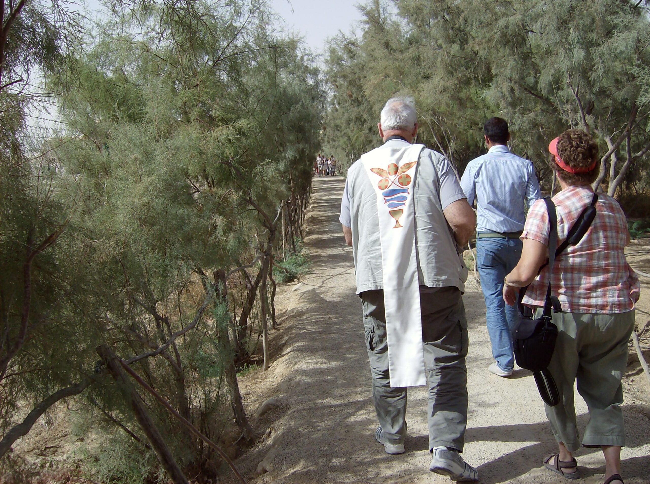 The group sets out on the long walk from the parking lot to the baptism site.