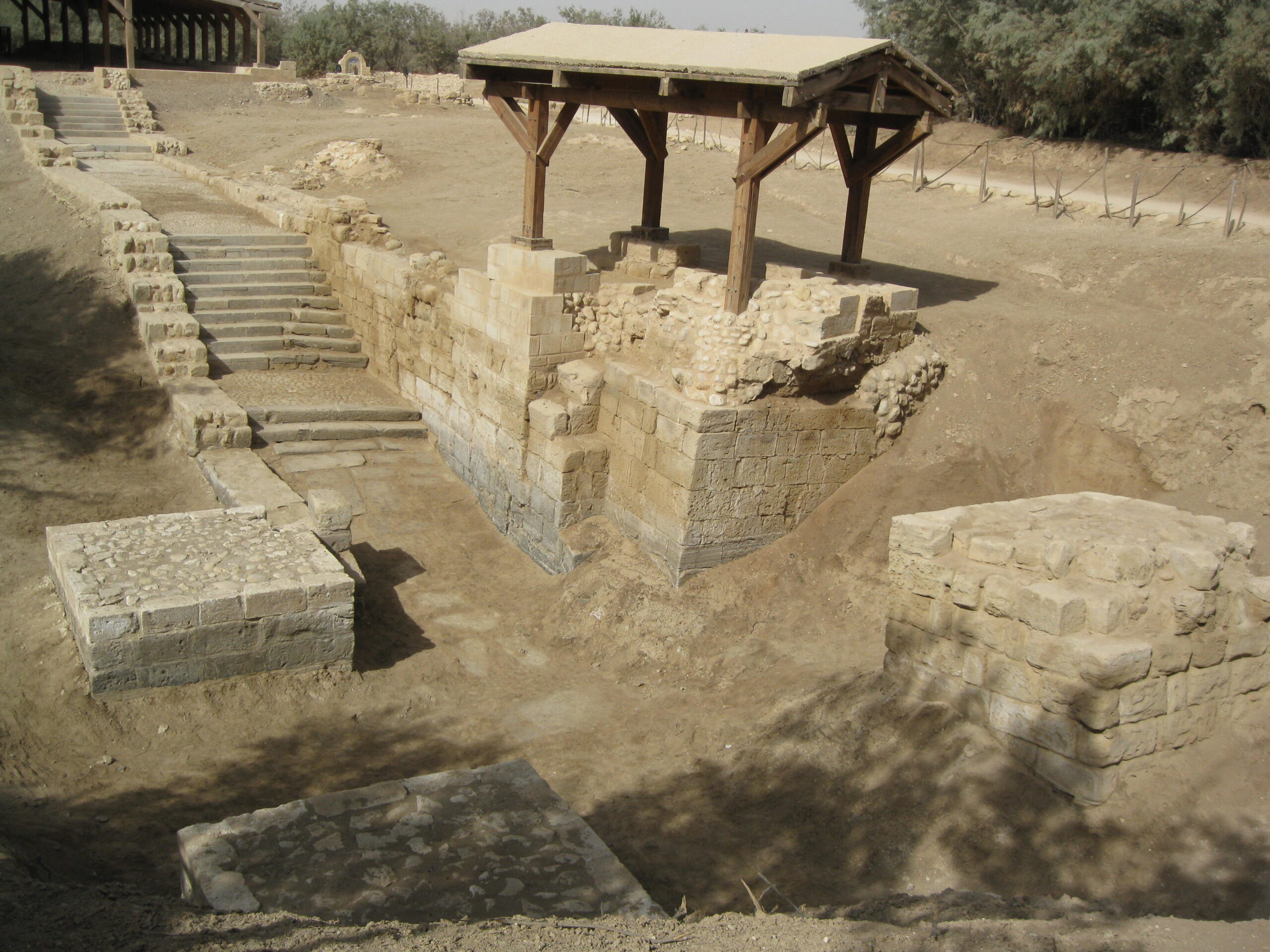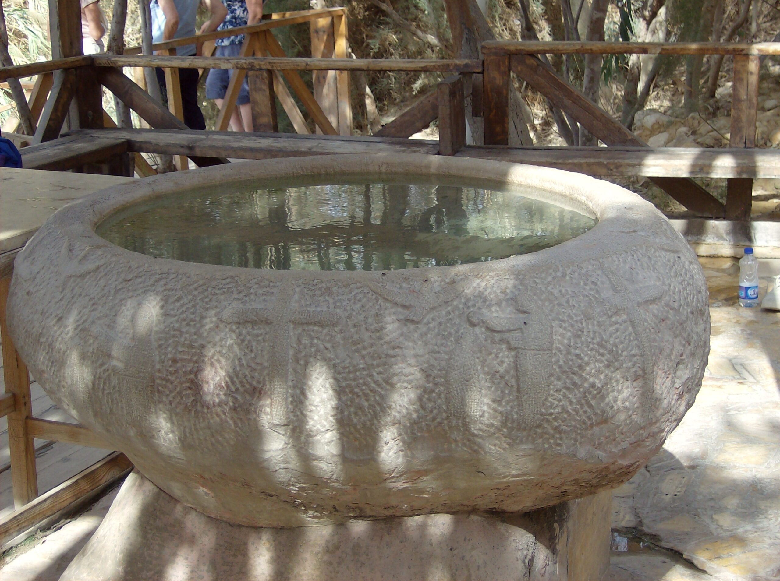 Baptism font under the shelter at the River Jordan.