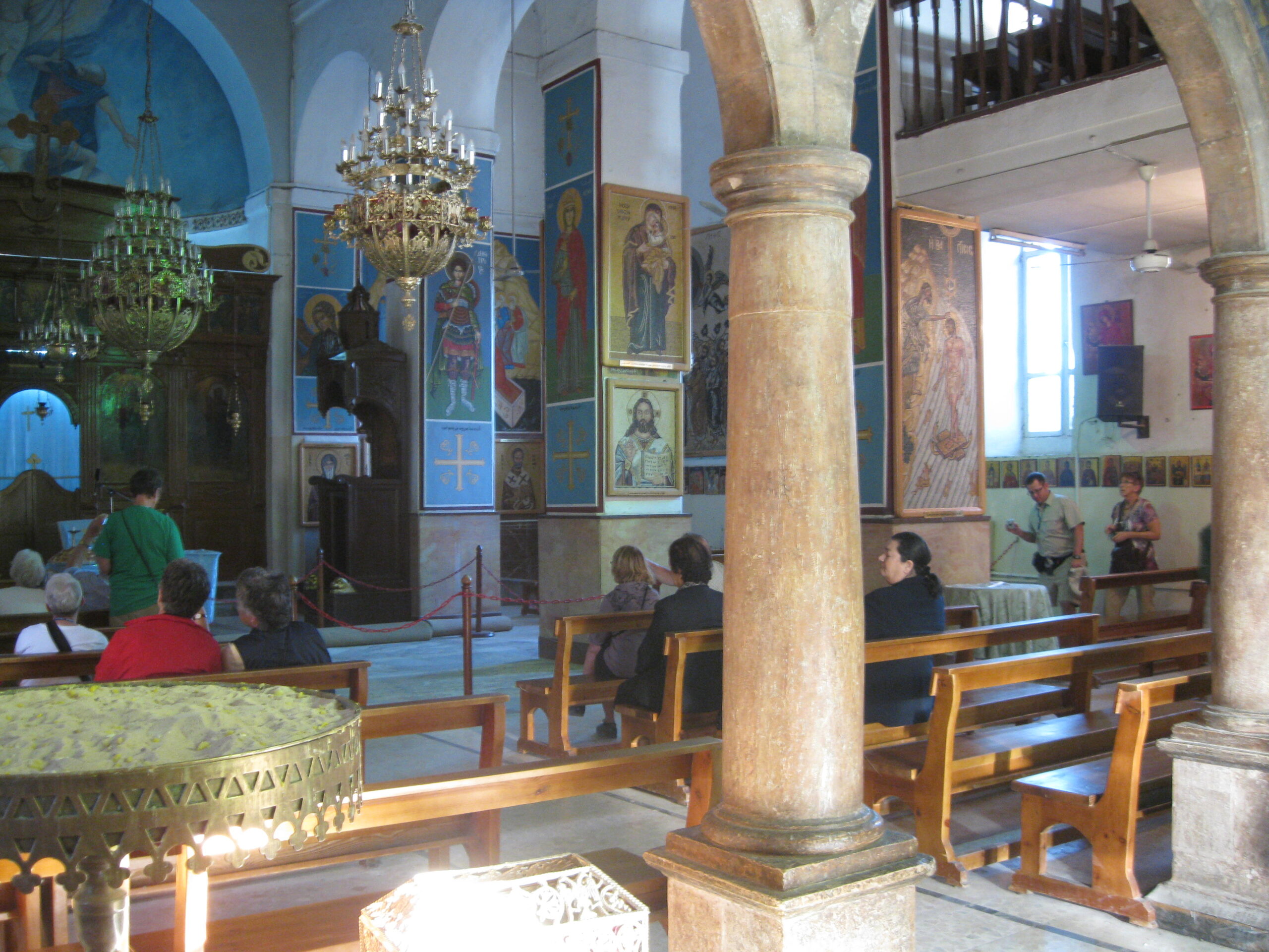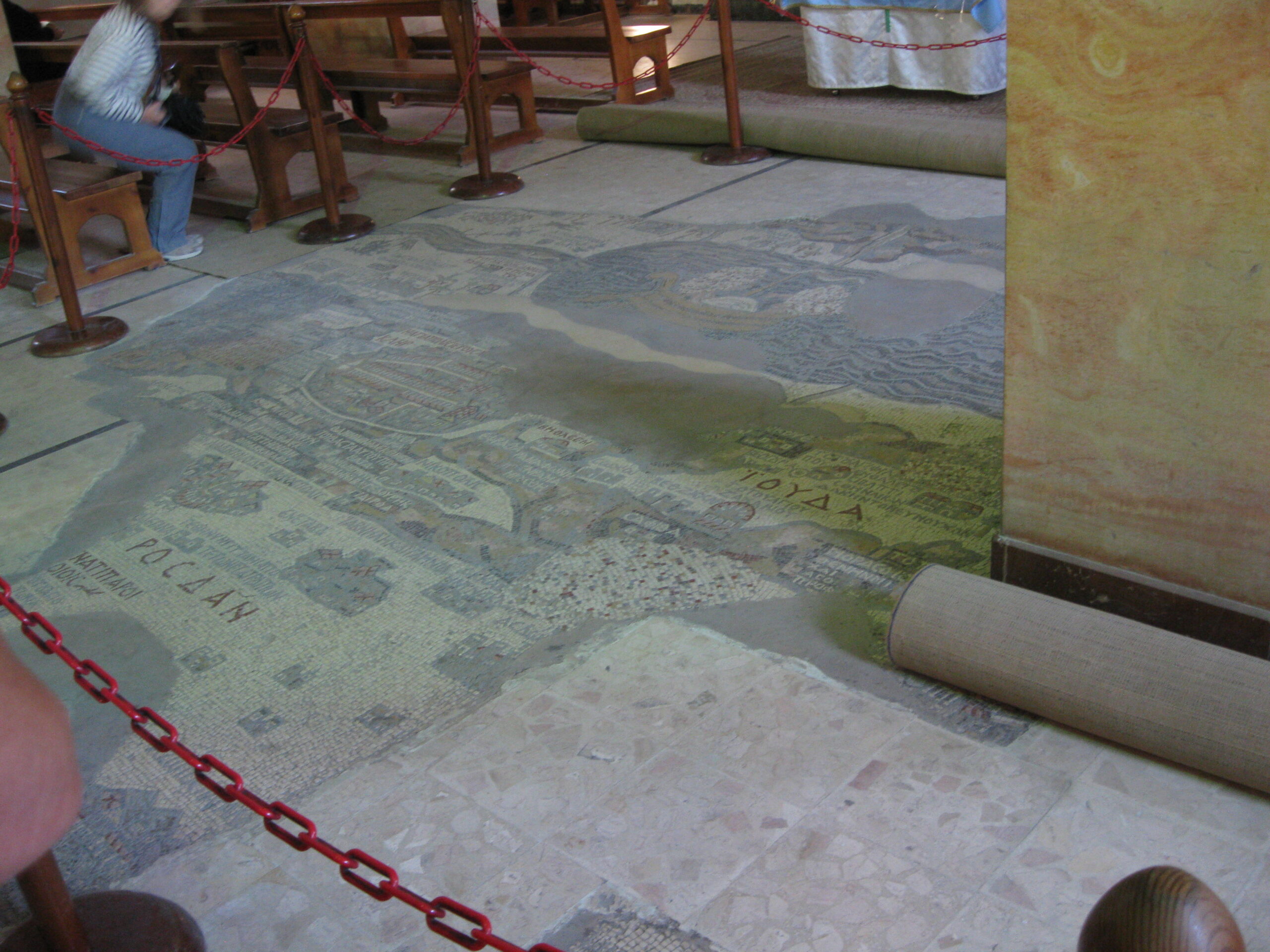 Then we were back on the road, now about 2 hours late. We just burned it back through Wadi Musa, right past the resort we had stayed at (I waved a sad goodbye to my glasses for a second time), and out onto the highway. Man, that driver drove as never before – at least on our trip so far! We had a quick stop for lunch (another 1 JD for bathroom break, this is getting annoying), and then off to Madaba to see an Orthodox church with an amazing ancient map mosaic on the floor. Now, apparently, the mosaic was part of a very old cathedral that fell into ruins, but some folk re-discovered the ruins in the 19th century and built the modern church on top, to preserve the mosaic and re-consecrate the site.