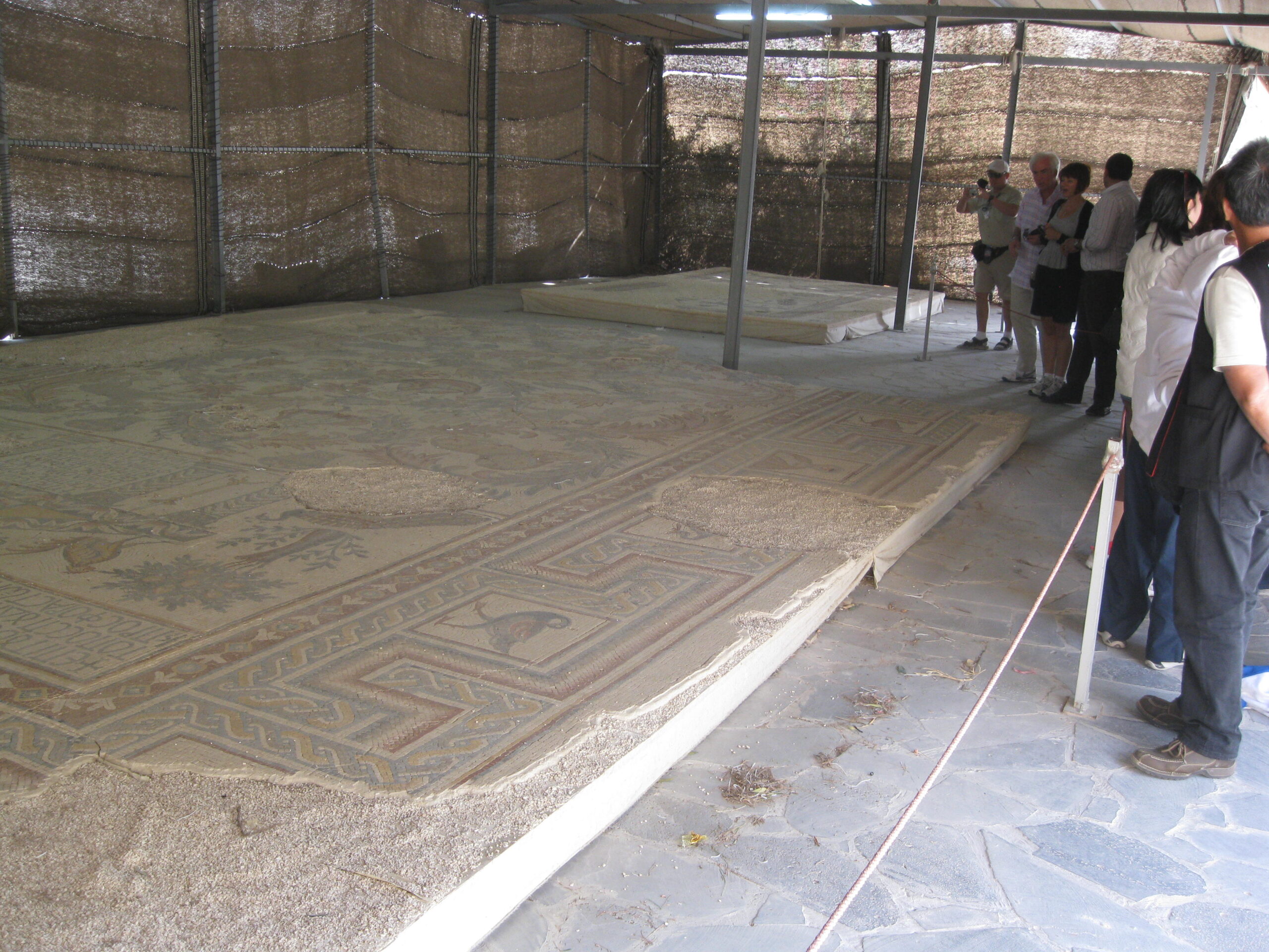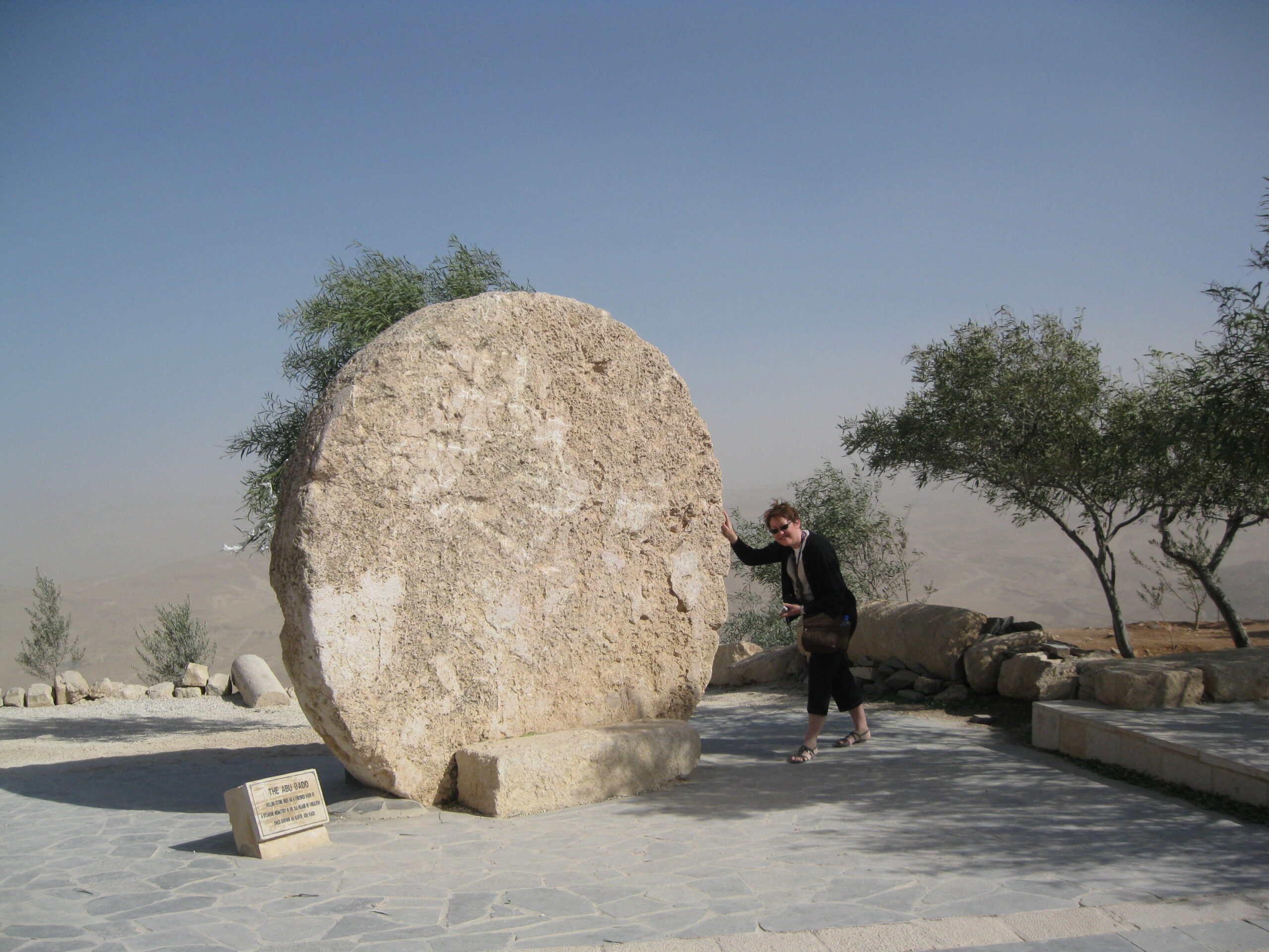 Unfortunately, today it was very windy – yikes, almost gale force winds! A veritable desert sandstorm. Our guide had to cover his eyes as he spoke to us, the sand was whipping around so fiercely. Because of the sand, we couldn’t see much of anything from up there, so sad. But it was interesting anyway. There are portions of ancient mosaics rescued from old churches on this site. There are commemorative monuments and buildings (under construction) from a visit by Pope John Paul II in 2000.