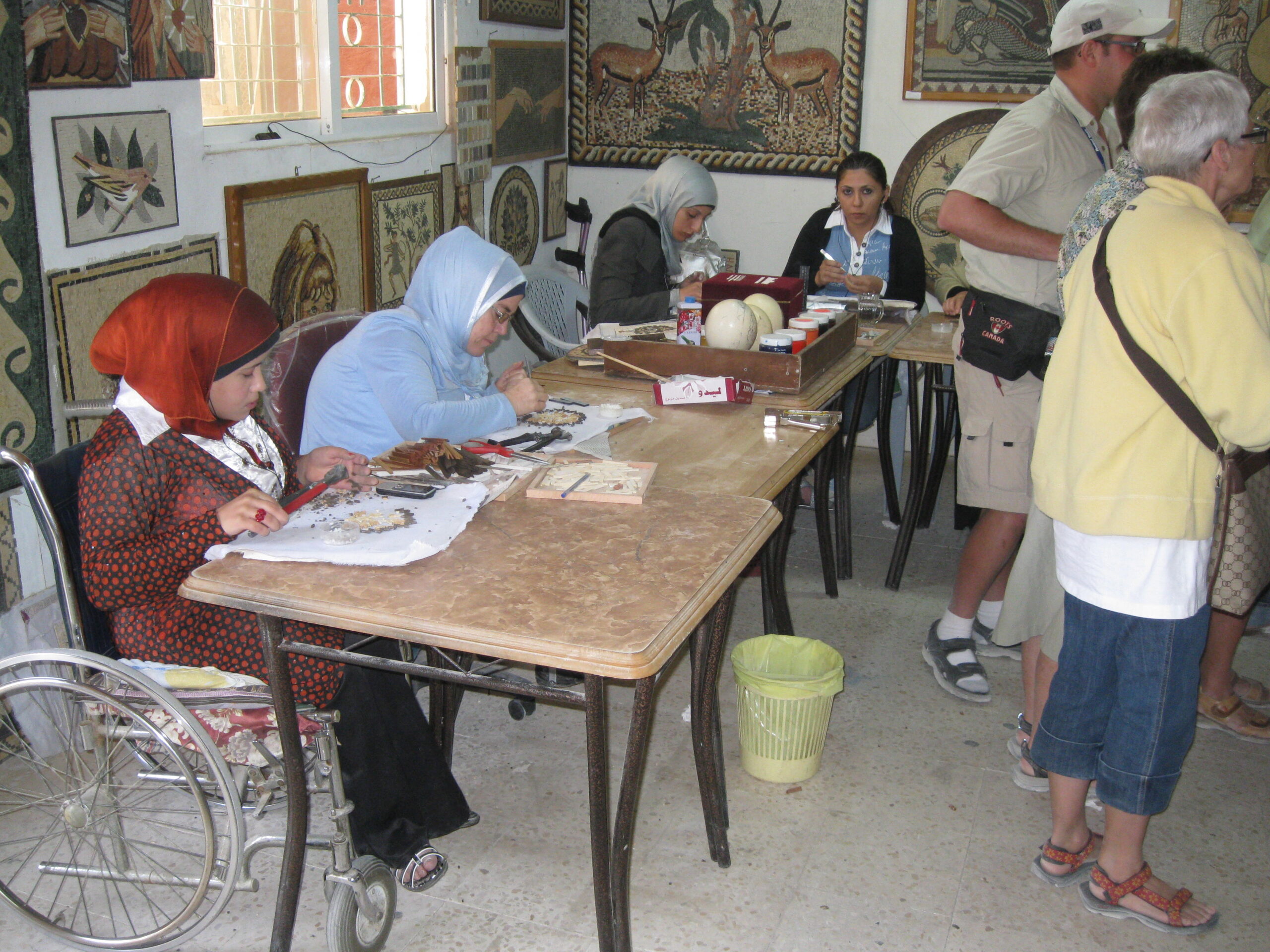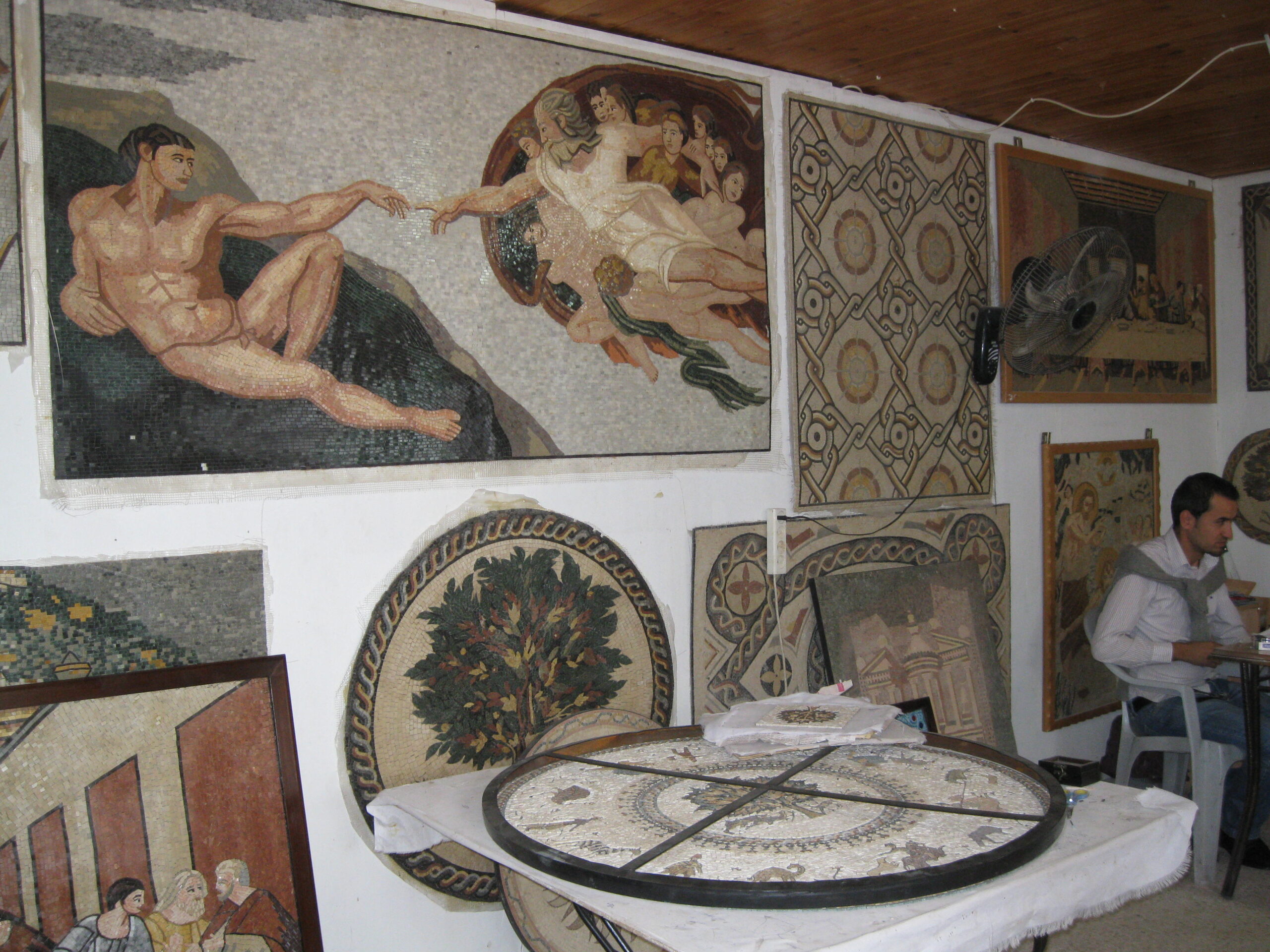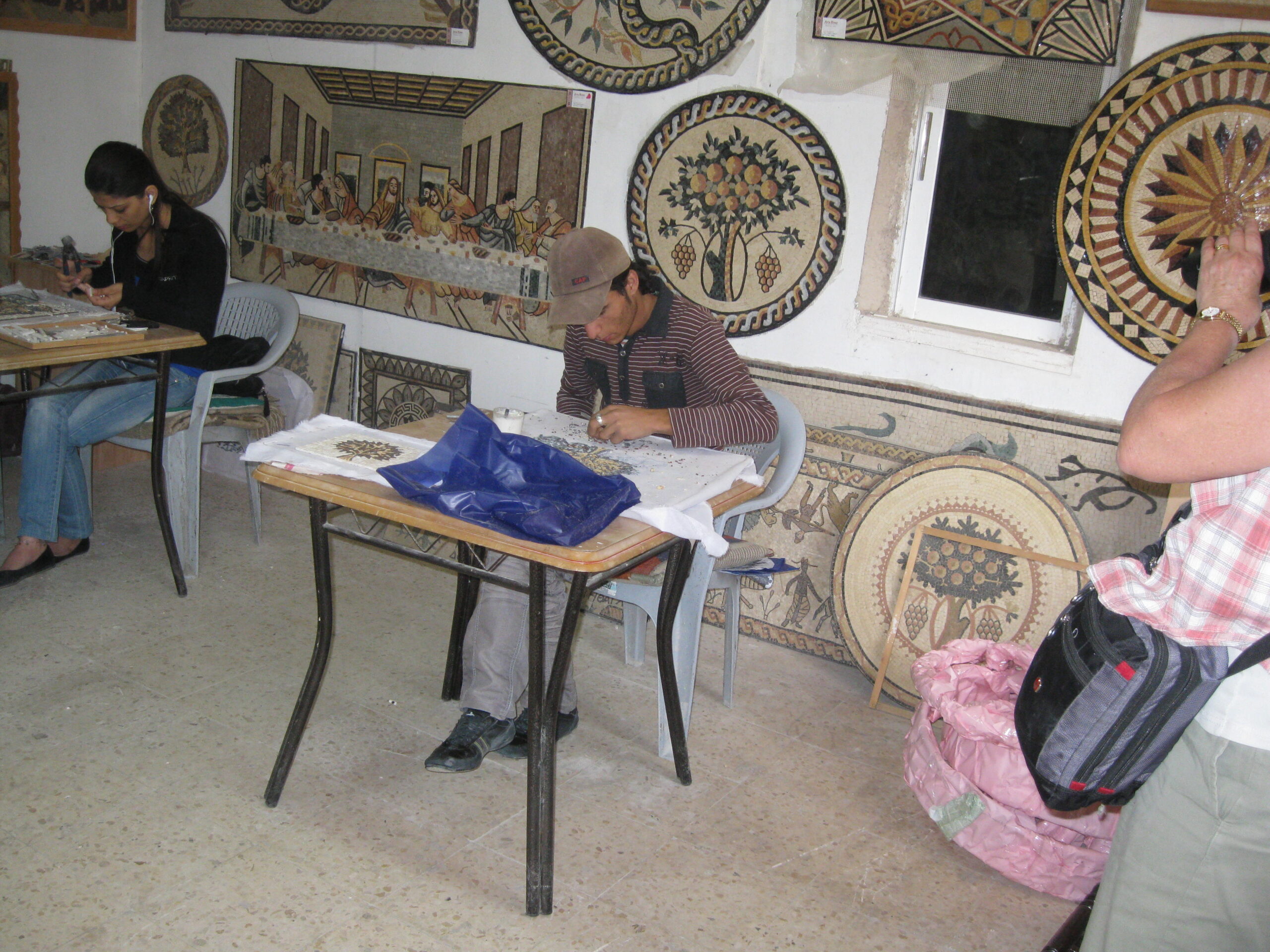 We then visited the Madaba Mosaic Workshop, just down the road. The mosaics that they make are amazing! Starting with relatively consistent slivers of twenty five different colours of stone, they snip various shapes and sizes of pieces off, then apply them to a base to make an elaborate image. These images range from small (maybe 6″ on a side) to huge (6 ft on a side). There are two techniques used: