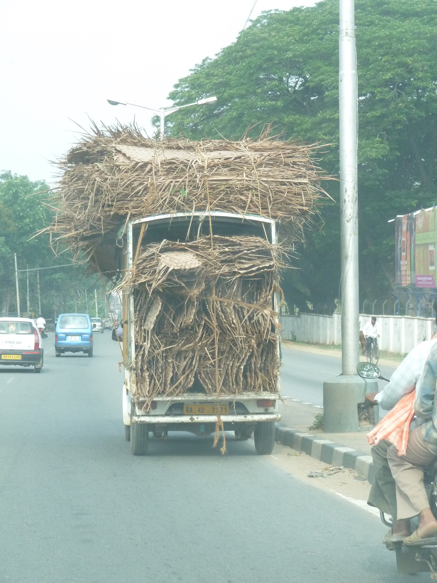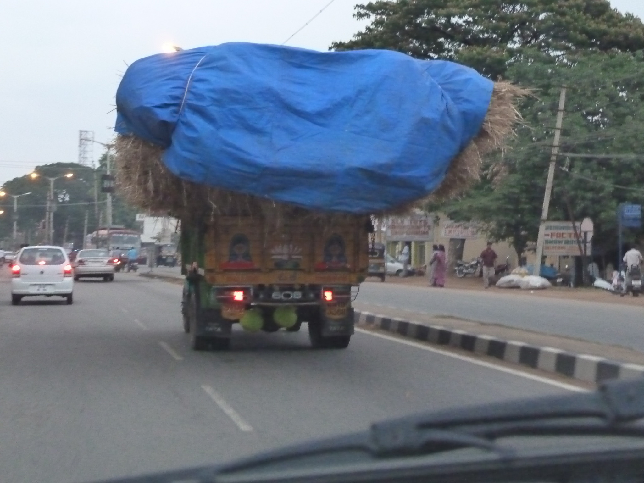 The drive was… interesting. So many different things on the road. Motorbikes with 1, 2, 3, and 4 people on them (more to say on that later), auto rickshaws, cars, trucks, overcrowded buses, trucks with boxes filled with people, trucks filled to overflowing (hay for instance) so they were twice their normal width, bicycles, pedestrians – you name it. A new one for me were truck frames with engine, a hood, a seat and steering wheel, and a young man driving it – no windshield, no cab top – we saw 3 of those. I learned later that they were going from the frame plant to the body plant… fair enough, but in Canada, they would be on a flatdeck. Not so here :-)