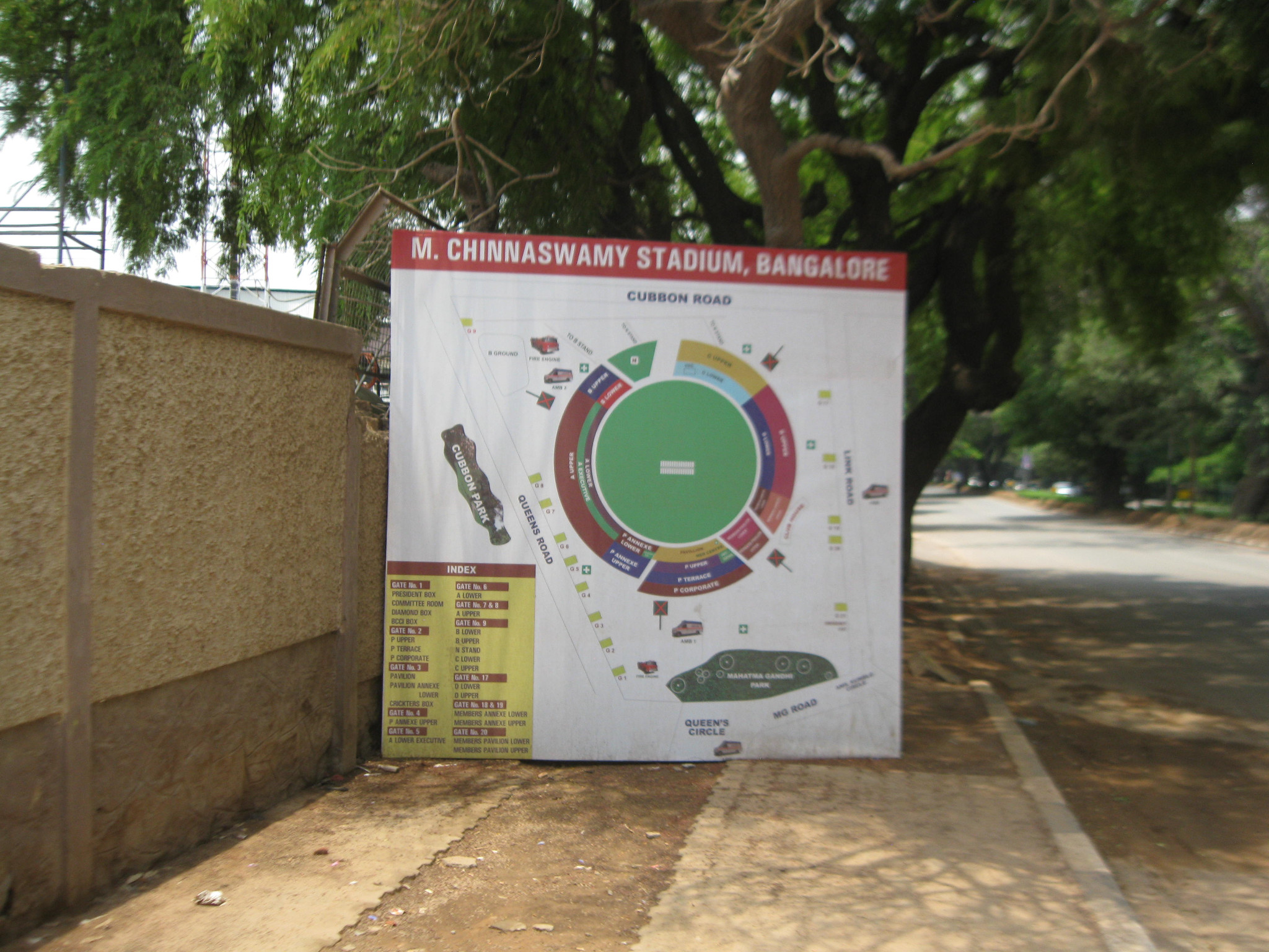 Emerging from the far end, I came back down the other side of the street, walking past a huge cricket stadium, M. Chinnaswamy Stadium, where the Bangalore Royal Challengers play.