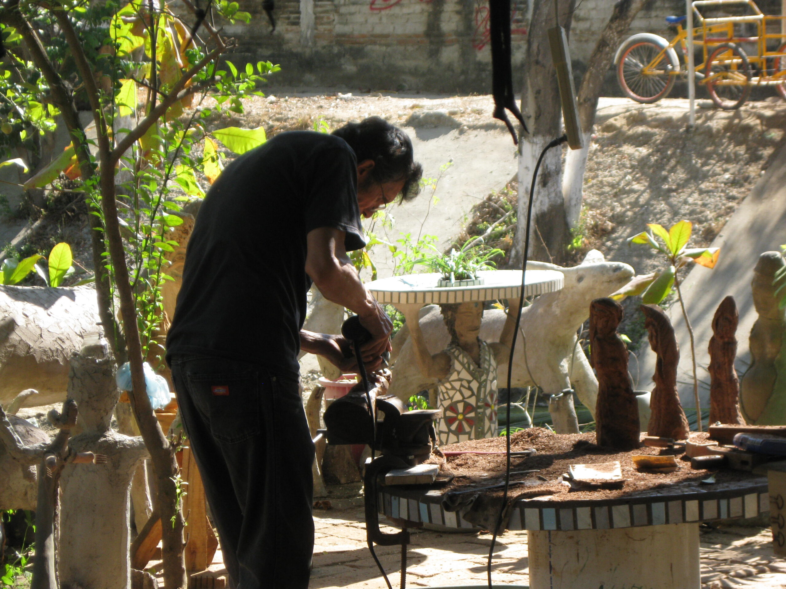A craftsman making objects of art from pieces of wood, with a Dremel tool.