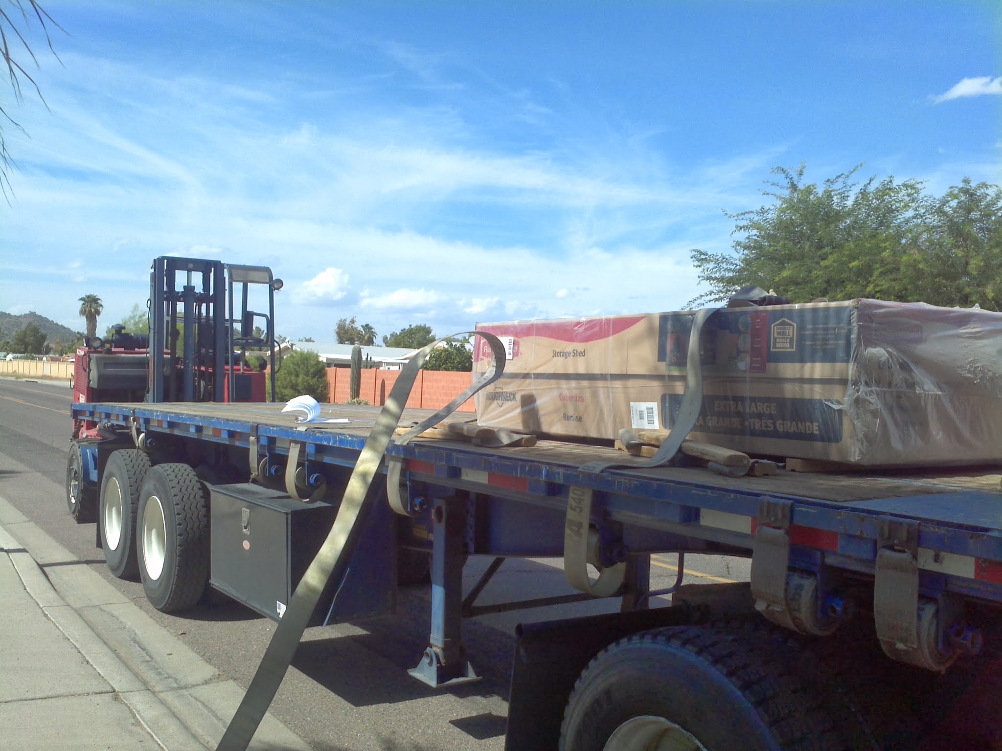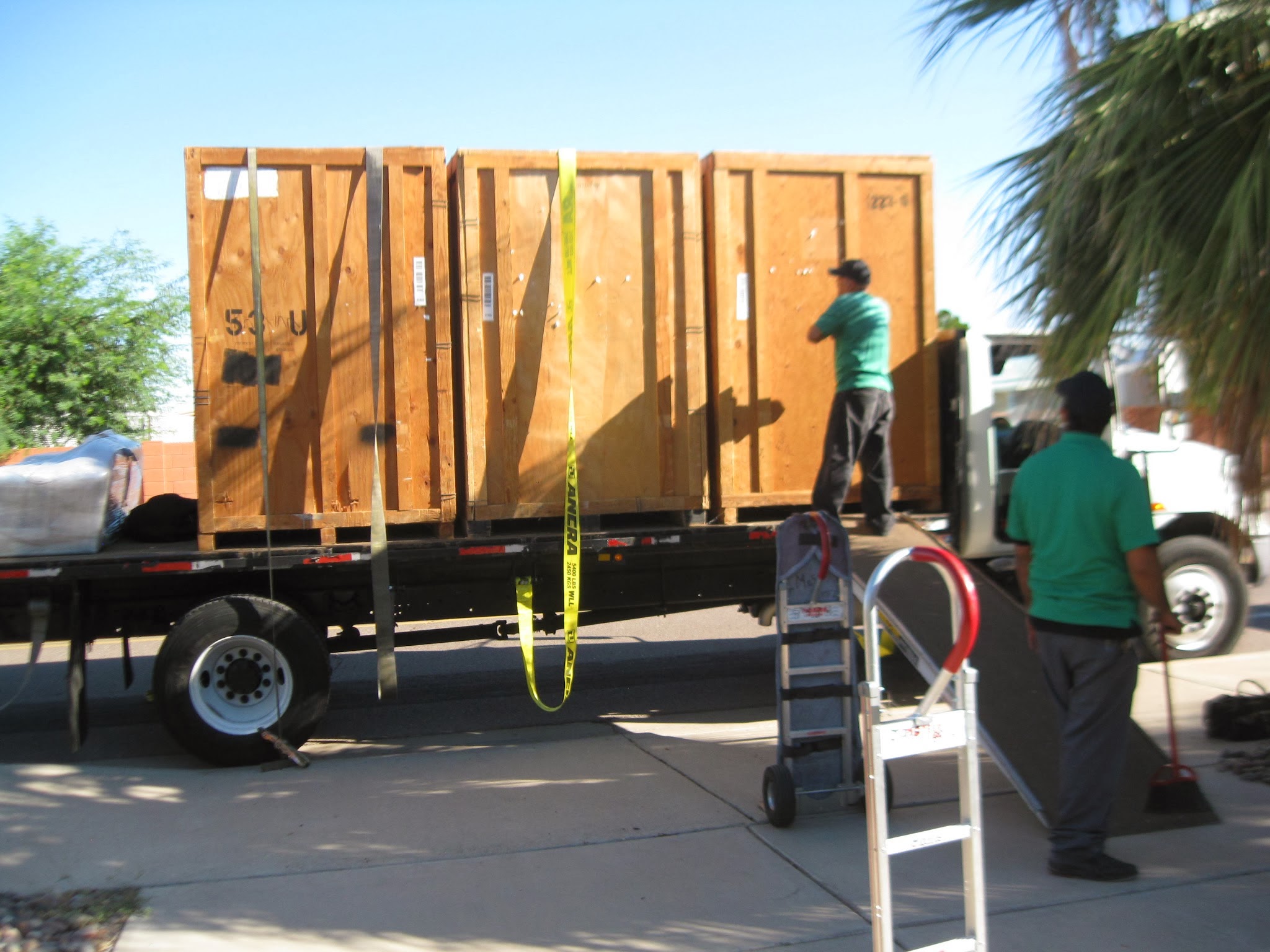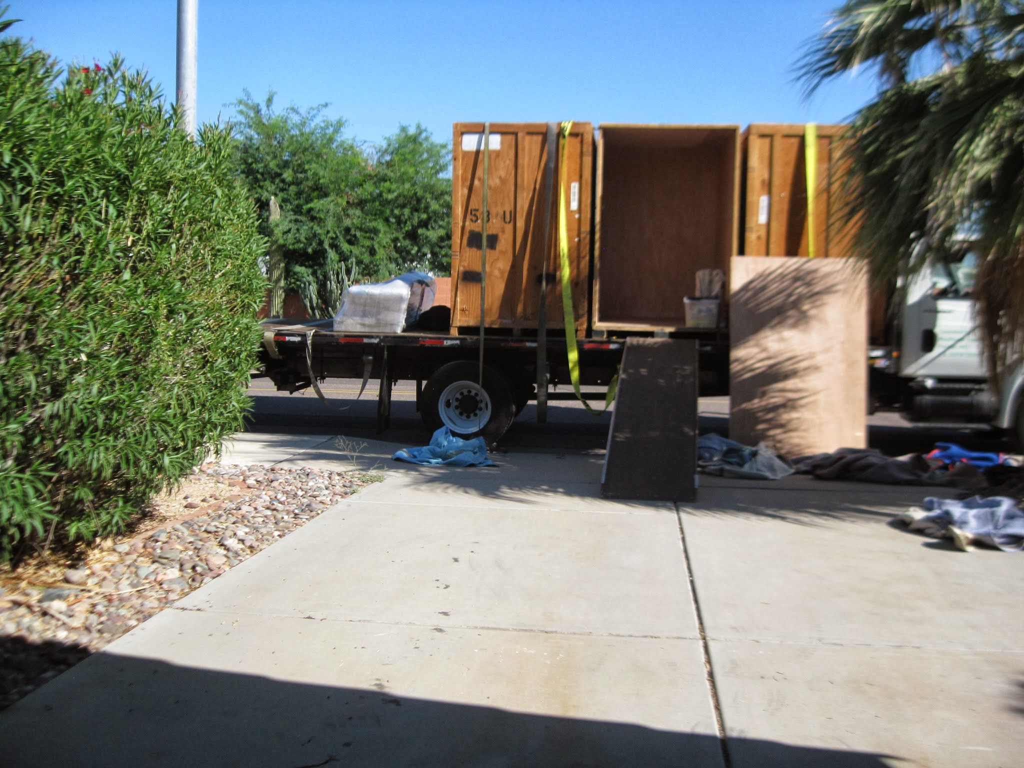large crates on the back of a flat deck. The two guys put a ramp to the flat deck, dropped the side of the first crate, and started wheeling stuff down into the garage and (optionally) into the house.